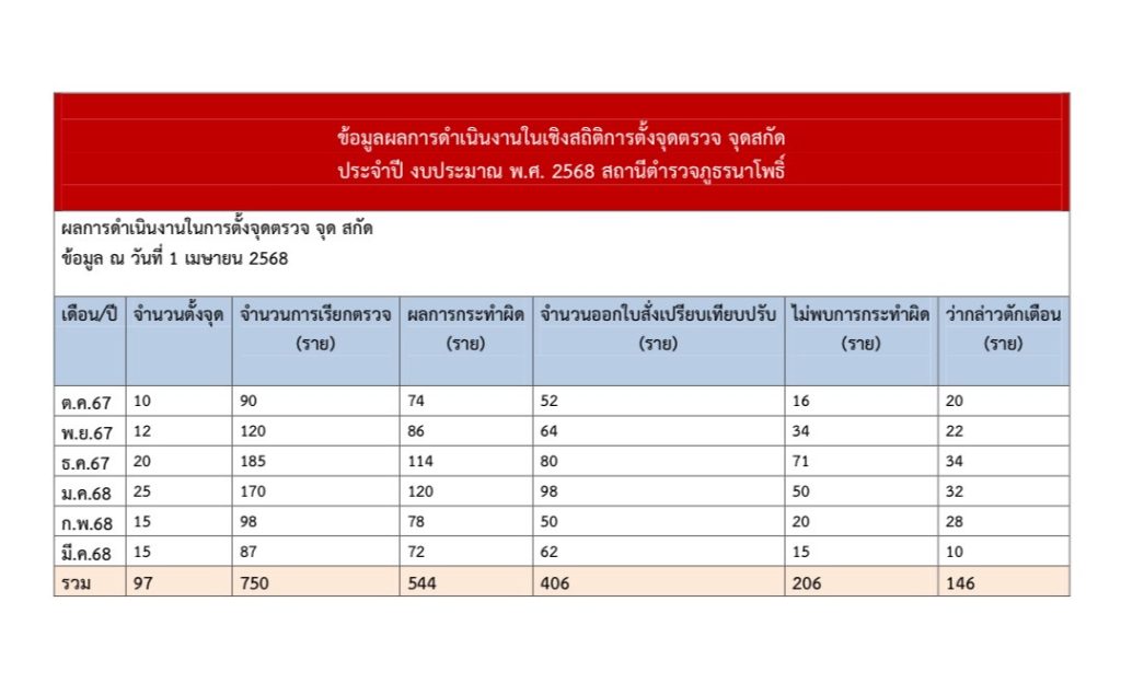 ข้อมูลผลการดำเนินการเชิงสถิติ ในการตั้งจุดตรวจจุดสกัด